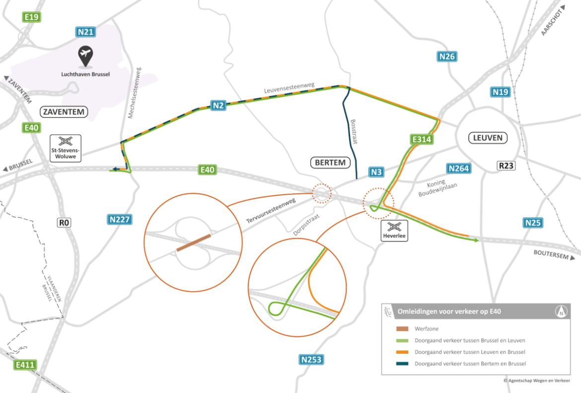 - Er geldt in beide richtingen een omleiding via de N227 (Mechelsesteenweg) en N2 (Leuvensesteenweg/Brusselsesteenweg) tussen op- en afrittencomplex [21] Sterrebeek op de E40 en complex [17] Winksele op de E314.