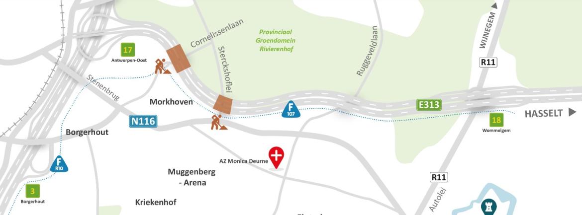 - Het verkeer op de E313 vanuit de Kempen/Hasselt/Luik in de richting van Antwerpen moet tijdens de afsluiting de snelweg verlaten via afrit [18] Wommelgem en zijn weg richting Antwerpen op het onderliggende wegennet voortzetten.